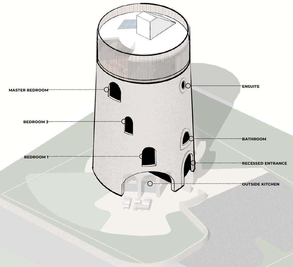 Die Form soll gegenüber dem bestehenden Gebäude unverändert bleiben, wobei auch der unaufgeregte Umgang mit Details und Materialien beibehalten werden soll. Der Schwerpunkt liegt auf der Lesbarkeit der früheren Nutzung des Turms.